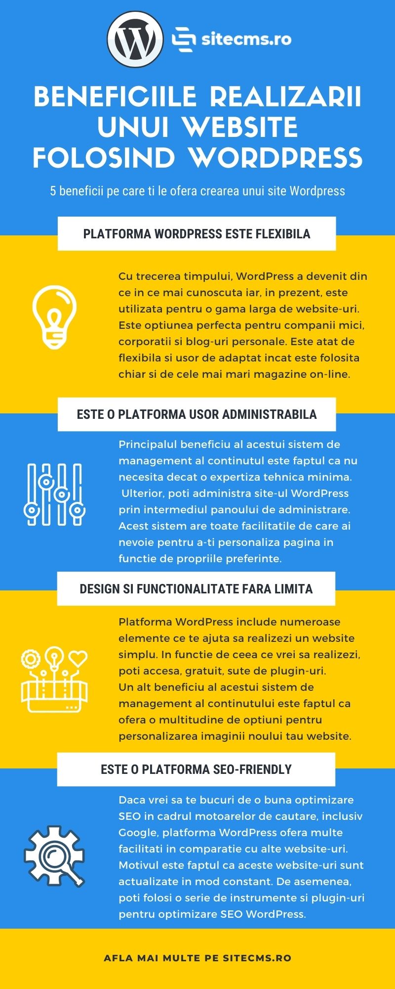 Acestea sunt doar cateva dintre beneficiile oferite de WordPress celor care doresc sa isi realizeze un website. Daca ai intrebari referitoare la realizarea unui site WordPress lasa-ne un comentariu in sectiunea de mai jos si vom face tot posibilul sa te ajutam. Succes!